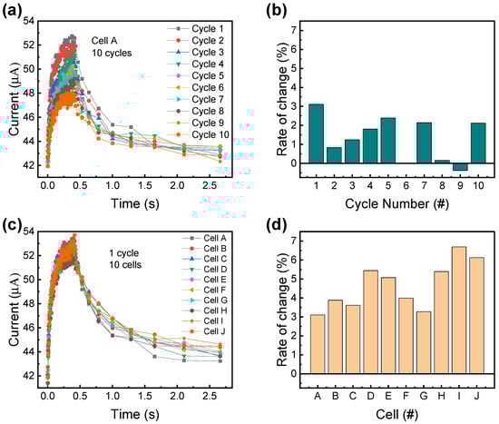 The rate of change should be small to reduce variability in the iterative accumulation and decay process. A change of 3% or less was observed in all 10 cycles. Figure 4c,d show the accumulation and decay curves of the first cycle of 10 cells and their change rate. The change rate of the first cycle is 3% or more. Figures S1 and S2 show the 10 cycles of the 10 cells.
