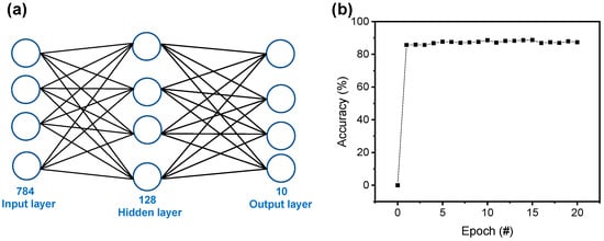 Finally, we perform pattern recognition accuracy of Fashion MNIST by constructing a 3-layer neural network (784 × 128 × 10) when applying the conductance update of the Pt/HfO2/TaOx/TiN device in Figure 5a [31]. To classify the pattern images of the Fashion MNIST dataset, a 28 × 28 pixels image is normalized with a value between 0 and 1, and the images are unfolded to a 1-dimensional array (784 × 1) for the number of input neurons. The neural network has 128 nodes for the hidden layer. Each output node corresponds to the 10 classes of training and test images which correspond to the 10 output nodes. All neuron nodes in the neural network are fully connected with an imaginary artificial synaptic array (Pt/HfO2/TaOx/TiN device array) in which the weight has a quantized value, and a cross-point array structure can be performed by a vector-matrix multiplication operation. Figure 5b shows the result of the accuracy test as a function of epoch, in which the maximum accuracy is 88.6%.