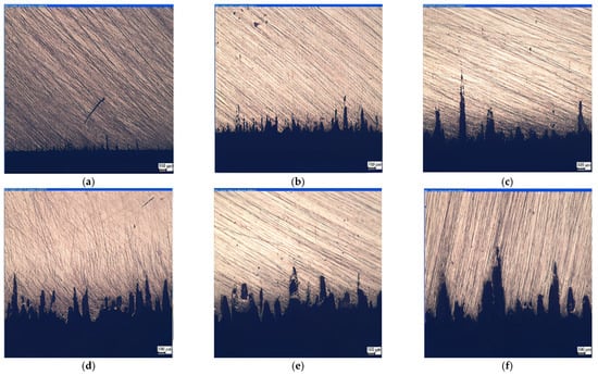 Observation of corrosion thickness using optical microscope. (a) The corrosion time is 2 h; (b) the corrosion time is 4 h; (c) the corrosion time is 6 h; (d) the corrosion time is 8 h; (e) the corrosion time is 10 h; (f) the corrosion time is 12 h.