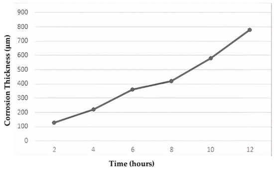 Changes in corrosion thickness according to time. After 12 h of corrosion, the corroded thickness can reach 800 μm.