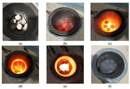 The whole process of melting and slag formation. (a) Prepared specimens and reagents were placed in a graphite crucible as an order of the reagents under the specimens; (b) to preheat the machine, the power is controlled within 2 kw; (c) gradually increase the power; (d) when the power reaches 15 kw, the metal is melted and slag is also formed; (e) liquid metal can be seen after breaking the solidified slag cover; (f) picture after cooling.