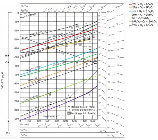 According to the Ellingham diagram (Figure 7) [], the Gibbs free energy of cobalt is highest, and the stability of cobalt oxide is the lowest. Therefore, at the time of melting, oxygen first bonds with a stable element to form an oxide, and it is difficult to form stable cobalt oxide and decontaminate it. Hence, we were not satisfied with the result of cobalt decontamination. However, based on the experience and knowledge gained from this research, we are planning to increase the decontamination effect of cobalt, such as by supplying oxygen and carburizing.