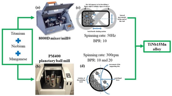 For these reasons, the present work is focused on the synthesis of a TiNb15Mn (in wt.%) alloy through MA, by employing two different devices (a PM 400 planetary ball mill, and an 8000D mixer/mill® shaker mill) and two different ball-to-powder ratios (10:1 and 20:1). The effects of these milling parameters and devices used on the crystallographic structure, and the morphology of this TiNb15Mn alloy, are subsequently investigated and discussed.