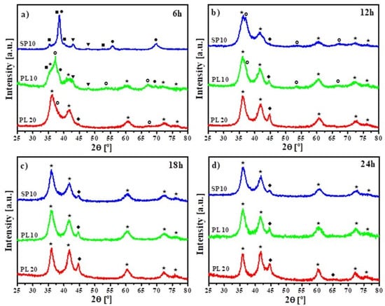 XRD patterns for the TiNb15Mn as-milled powdered mixtures, at 6 h (a), 12 h (b), 18 h (c) and 24 h (d). SP10: milled in the 8000D mixer/mill® with a BPR equal to 10; PL10 and PL20: milled in the PM 400 planetary mill with a BPR equal to 10 and 20, respectively. (■) Ti (hcp, P63/mmc SGS); (●) Nb (bcc, Im3m SGS); (▼) Mn (bcc, I-43m SGS); (○) bcc-TiNbMn alloy (Im3m SGS); (★) fcc-TiNbMn alloy (Fm3m SGS); (♦) Fe (bcc, Im3m SGS).