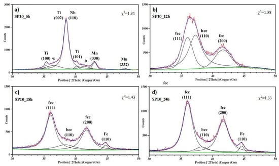 Subsequently, since the DRX patterns of Figure 2 showed many unresolved diffraction peaks between 2θ = 30°–50°, a deconvolution process was carried out to corroborate the phase indexation performed (Figure 3 and Figure 4). The goodness-of-fit for the deconvolution processes was determined by the chi-square (χ2) parameter, which is the typical parameter used for Rietveld analysis []. This parameter, usually close to one, was determined in all the cases to be approximately 1.4, thereby verifying the quality of the goodness-of-fit. The peak deconvolution process was therefore made for the specimens that were alloyed in the 8000D mixer/mill® (Figure 3), between 6 h and 24 h of milling time (i.e., SP10_6h, SP10_12h, SP10_18h, and SP10_24h). At the lowest milling time, SP10_6h (Figure 3a), the deconvoluted peaks matched the peaks of the raw transition metals (Ti, Nb, and Mn) that were previously indexed in Figure 2. However, an optimal deconvolution fitting was reached when a small reflection was added. Due to the low intensity, this reflection may be the bcc phase in an early state. At 12 h of milling time, SP10_12h (Figure 3b), the alloying process was complete, due to the coexistence of the bcc and fcc phases. For the two highest milling times, SP10_18h (Figure 3c) and SP10_24h (Figure 3d), the deconvolution process showed compelling results. In this case, the bcc phase was detected, although it could not be observed in Figure 2. The diffraction peak of the bcc phase became narrower and lower in intensity with the increase in milling time, while the peak intensity of the fcc phase increased. Therefore, the full conversion from raw materials to a unique fcc alloy was not totally reached after 24 h of milling time using the 8000D mixer/mill® (Figure 3d).