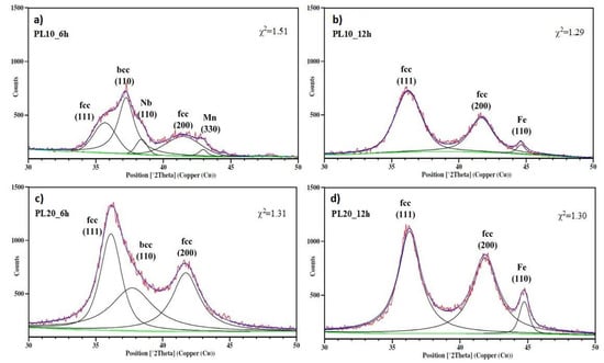 The same XRD deconvolution process was carried out for specimens that were alloyed in the planetary mill for 6 h (Figure 4a) and 12 h (Figure 4b). In this case, the deconvolution peaks were in good agreement with the results shown in the general XRD diffraction patterns (Figure 2). Therefore, the full conversion of the fcc phase from Ti, Nb, and Mn raw materials without the bcc phase, was reached after 12 h of milling time, using a BPR of 10 (PL10_12h) or 20 (PL20_12h).