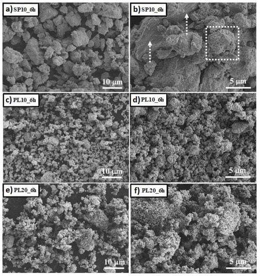 The particle morphology and average-size characterization of the synthesized phases were carried out using SEM images of the specimens after 6 h of milling time (Figure 5). The SP10_6h powders, Figure 5a,b, presented the characteristic morphology features of an early stage of a mechanical alloying process [], such as the following: (a) coarsened particles, due to plastic deformation and the cold welding of fine particles to coarse particles (marked with square dots in Figure 5b); and (b) a powder size reduction, due to multiple particle fractures (marked with white arrow dots in Figure 5b). These features are characteristic of ductile powders in the early stages of the milling process, due to repeated impacts between the balls and particles []. During MA, the powder particles are repeatedly flattened, cold-welded, fractured, and re-welded. The cold welding and fracturing processes can be predominant at any stage, and depends mainly on the deformation characteristic of the raw powders.