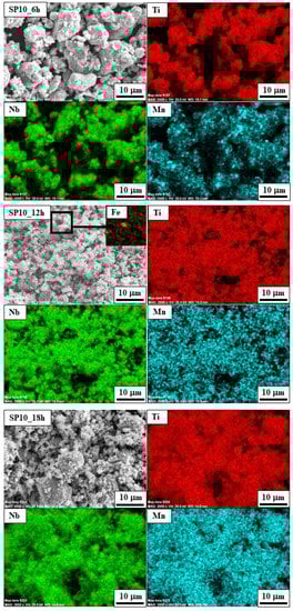 Characteristic compositional XEDS-SEM mapping for the elements existing in the SP10 specimens milled at 6 h, 12 h, and 18 h. Ti: red; Nb: green; Mn: light blue; Fe: orange.