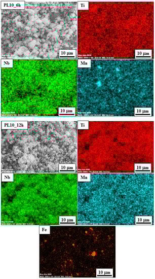Characteristic compositional XEDS-SEM mapping for the elements existing in the PL10 specimens milled at 6 h and 12 h. Ti: red; Nb: green; Mn: light blue; Fe: orange.