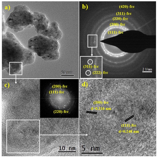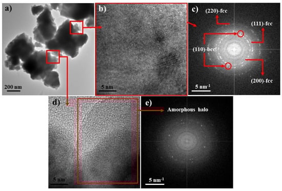 Finally, a crystallographic study was carried out by HRTEM, ED, and FFT in the SP10_18h (Figure 8) and PL10_24h (Figure 9) specimens, to corroborate the phase identification for the synthesized TiNb15Mn alloy. For the SP10_18h specimen, the milled powders exhibited a submicrometric particle size of approximately 0.2–0.3 microns (Figure 8a). The HRTEM (Figure 8b) and FFT (Figure 8c) images that were obtained in a selected particle show the concentric diffraction rings corresponding to the fcc-TiNb15Mn alloy. The crystallographic planes of the fcc phase, (111), (200), and (220), indicated in Figure 8c, are in good agreement with the corresponding interplanar distances determined by XRD, as shown in Table 2. Two opposing points (marked with red circles in Figure 8c) were detected between the rings corresponding to the (111) and (200) crystallographic planes. These points could correspond to the (110) crystallographic plane for the bcc-TiNb15Mn alloy. The bcc phase had already been detected in the deconvoluted XRD diffractogram pattern (Figure 3), where only a small single domain could be ascertained, but here, the interplanar distance and lattice parameter calculated for this (110) crystallographic plane are in concordance with the value obtained by XRD (Table 1). Furthermore, the HRTEM (Figure 8d) and FFT (Figure 8c) images that were obtained in a different particle, show a diffuse amorphous halo, which could be attributed to a partial amorphization process, induced by the mechanical alloying. According to Aguilar et al. [], the reduction in the Gibbs amorphization energy is enhanced by the addition of Mn to Ti.