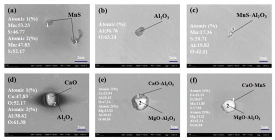 According to Figure 2d–f, it is obvious that there are CaO-Al2O3 complex non-metallic inclusions, MgO-CaO-Al2O3 complex non-metallic inclusions, and MgO-Al2O3-MnS complex non-metallic inclusions in H08A welding rod steel after calcium treatment. After calcium treatment, the inclusions in the steel are transformed to compounds of calcium, and by comparing the morphology pictures of inclusions, it can be found that the shape of inclusions tends to be more spherical after calcium treatment.