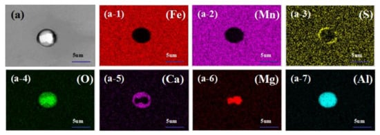 The type, quantity, size, morphology, and distribution of non-metallic inclusions in steel have great influence on the quality of metal products. The influence of inclusions on steel is mainly reflected in the corrosion resistance, toughness, plasticity, fatigue resistance, and so on [,,,,]. For H08A welding rod steel, the type, quantity, and size of inclusions in the steel are important factors to determine whether cracks, folds, scabs, and other defects occur in the steel. Moreover, the inclusions in welding rod steels have an important influence on the microstructure and mechanical strength of the weld deposit during welding. Generally, inclusions have a negative effect on the reliability and safety of welding rod steels’ structural materials [,,,,,,]. At present, the research of welding rod steels mainly focuses on crack resistance, fatigue, microstructure, and mechanical properties []. Hertzberg et al. [] and Anderson et al. [] found that the inclusion with stress concentration in welding rod steels can cause fracture at high-stress position, and the inclusion plays a key role in the crack propagation of steel.