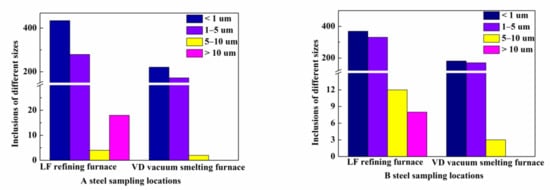 It can be seen in Figure 4 that the number of inclusions of small size (m ≤ 1 μm) accounts for the majority in each process, which is consistent with Ramirez’s [] conclusion that the average diameter of non-metallic inclusions in welding rod steels is between 0.3 μm and 0.6 μm. The small inclusions are reduced from LF to VD, which indicates that soft blowing treatment of molten steel after feeding aluminum wire has a good effect on the removal of inclusions. For the inclusions with larger size (m > 1 μm), there are more inclusions in the LF refining furnace, but the number decreases after the VD vacuum smelting furnace. One of the reasons is that most of the large inclusions in the initial liquid steel are Al2O3 inclusions, but after feeding calcium wire treatment, the calcium-aluminate complex non-metallic inclusions are formed and removed. Second, the soft blowing treatment of molten steel is very beneficial to the floating of large particle inclusions, so the number of inclusions has decreased; it can also be explained by Stokes’s law that large inclusions can be separated faster and easier than small inclusions.
