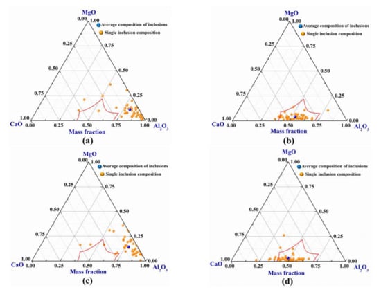 The composition of magnesium inclusions in steel samples from LF and VD furnaces (before and after calcium treatment) was analyzed by EDS. The percentages of Mg, Al, Ca, and O elements of non-metallic inclusions in steel were obtained by energy dispersive spectrometer. These percentages were attributed to the mass percentages of MgO, Al2O3, and CaO inclusions in the steel. Then the mass percentages of the three oxide inclusions are projected into the ternary phase diagram of the MgO-Al2O3-CaO system. The results are shown in Figure 6. In Figure 6, the red curve region is the liquid region of the low melting point inclusion at a temperature of 1873 K.