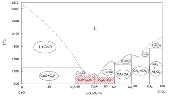 In the calcium treatment process, its main purpose is to change the high melting point Al2O3 inclusion (melting point 2054 °C) into a composition close to 12CaO·7Al2O3 inclusion (melting point 1392 °C), so as to reduce the harmful effect of Al2O3 inclusion and improve the castability of molten steel. The binary system phase diagram of Al2O3-CaO is shown in Figure 7. In Figure 7, it can be seen that the composition of low melting point compound is between C3A and C12A7. However, improper calcium treatment process may lead to the formation of CaO, CaS and high melting point calcium-aluminate complex non-metallic inclusions (CA, CA6, and CA2). These inclusions are not easy to float and remove in molten steel, which greatly increases the probability of blocking the nozzle. Some researchers have pointed out that improper calcium treatment is more likely to cause clogging than no calcium treatment [,].