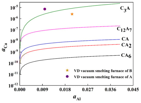 Based on the phase diagram of CaO-Al2O3 system, it is shown that low melting point calcium-aluminate complex non-metallic inclusions will be formed when inclusions are formed between C3A and C12A7. As can be seen in Figure 8, when the aluminum activity in steel is constant, the calcium activity only needs to be within an appropriate range to achieve the desired effect of calcium treatment. According to the activity values of calcium and aluminum in A and B steel VD furnaces in Table 6, two points in Figure 8 are obtained. The results of thermodynamic calculation show that the inclusion types after calcium treatment are C12A7 and C3A. This is consistent with the experimental results, indicating that calcium treatment is effective.