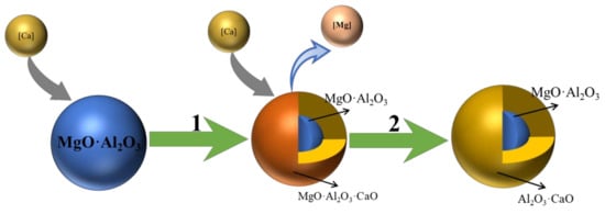 In Figure 9, each type of inclusion is assumed to be spherical. Ca in the molten steel is transferred to the surface of MgO-Al2O3 spinel and reacts with it as shown in Process 1 in Figure 9. The reaction process is expressed by formula (12). In this process, Ca reacts with MgO-Al2O3 spinel surface to form a complex inclusion outer layer of CaO-MgO-Al2O3. Mg from the reaction is transferred to the molten steel.