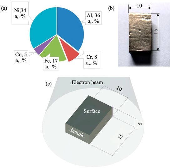 Samples with sizes 15 mm × 10 mm × 5 mm were cut from the manufactured workpiece. Before surface modification the samples were polished with SiC paper down to 2500 grit paper. Then samples were irradiated by a high-current pulsed electron beam using a “SOLO” unit (Institute of High Current Electronics, Tomsk, Russia) (Figure 1c) []. The irradiation mode was as follows: the energy of accelerated electrons 18 keV, the density of an electron beam (10, 20, 30) J/cm2, the duration of a beam pulse 50 µs, the pulse repetition frequency 0.3 s−1, a number of irradiation pulses 3, residual pressure of an inert gas (Ar) in the processing chamber 2·10−2 Pa (Figure 1c).