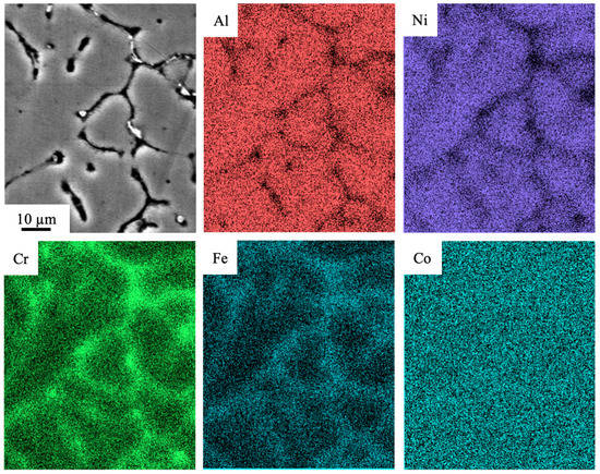 The structure of the high-entropy AlCoCrFeNi alloy obtained via wire-arc additive manufacturing (WAAM) in the inert gas atmosphere (Ar) was thoroughly investigated in our previous works [,]. The alloy has a dendritic structure, and it is suggested that the distribution of alloying elements in the volume of an ingot is inhomogeneous. Using the method of mapping, the inhomogeneous distribution of mentioned above elements in the alloy volume was revealed: boundaries of grains and zones near them are enriched with atoms of chromium and iron, the volume of grains contains atoms of nickel and aluminum, and cobalt exhibits the quasi-inhomogeneous distribution in the alloy (Figure 2). The images in Figure 2 were obtained during the SEM study on the LEO EVO 50 device.