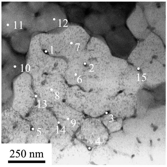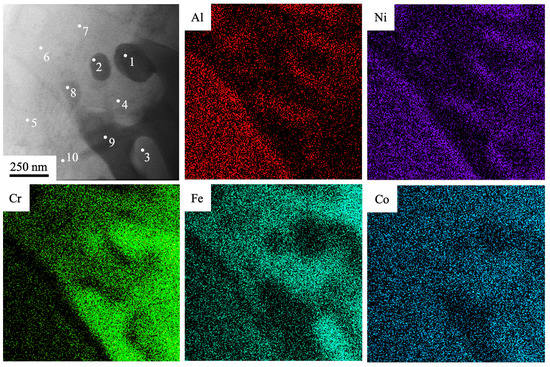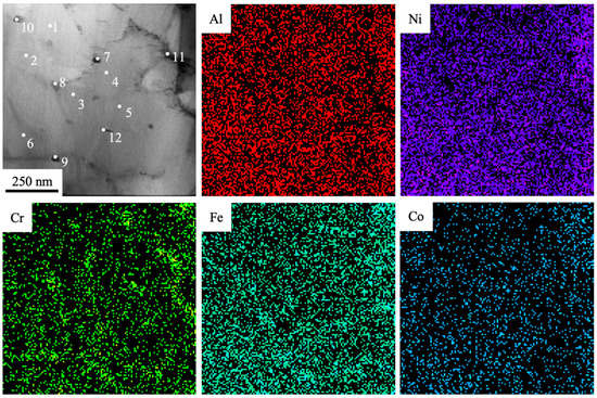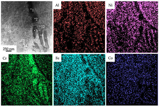 The TEM-EDS elemental mapping of the fabricated Al-Co-Cr-Fe-Ni HEA via wire-arc additive manufacturing and irradiated by HCPEB (10 J/cm2, 50 µs, 3 pulses, 0.3 s−1). The numbers indicate areas where EDS analysis was carried out.
