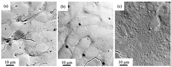 The electron beam surface modification induces dramatic changes in the microstructure of the sample (Figure 4). The irradiation of a HEA by a pulsed electron beam with the electron beam density ES = 10 J/cm2 causes no disintegration of a dendritic crystallization structure (Figure 4b), which is typical for the original alloy (Figure 2a). This fact evidences the surface of modified samples did not melt. The liquid-phase transformation of the surface layer structure in a high-entropy alloy is detected only in zones near the boundaries of a dendrite structure. It can be assumed that microcracks (Figure 4) occur in a thin surface layer due to the high (105–106 K/s) cooling rates of the surface layer of the sample initiated by irradiation with a pulsed electron beam. HCPEB irradiation induces dynamic temperature fields in the surface layers giving rise to superfast heating, melting, and evaporation, followed by superfast solidification of the material []. The dynamic stress fields formed cause intense deformation processes in the material. As a result, along with metastable structure-phase states providing improved physical, chemical, and strength properties of the material unattainable with conventional surface treatment techniques in the surface layers, microcracks may appear [].