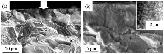 SEM images of a surface fracture of HEA irradiated by HCPEB (20 J/cm2, 50 µs, 3 pulses, 0.3 s−1). (a) Magnification × 2500. (b) Magnification × 10000. The arrow (a) indicates the irradiated surface.