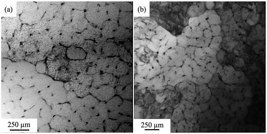 A high-current pulsed electron beam has proven to be an effective tool for the microstructural modification of steels [,], Al-Mg [], and Ni alloys []. However, only a few studies have been devoted to surface modification of HEAs by HCPEB. Lyu at al. studied the correlation between the number of pulses and the microstructure and properties of as-cast CrFeCoNiMo0.2. It has shown that the surface microhardness and wear resistance of the alloy were improved after HCPEB irradiation, mainly resulting from the dispersion strengthening of the hard reinforced σ phase and the fine grain strengthening of the FCC ultrafine crystals. The maximum microhardness (392.9 HV) and lowest wear rate (0.92 × 10−4 mm3·N−1 m−1) was obtained after 35-pulsed irradiation []. Nahmany et al. applied electron beam bead-on-plate melting for welding Al0.6CrFeCoNi and Al0.8CrFeCoNi high-entropy alloys []. Melted zones obtained by electron beam surface remelting of HEA displayed a significant increase in microhardness relative to the base metal.