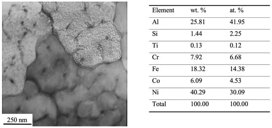 The images in Figure 3 were obtained during the TEM study on the JEOL JEM-2100 device. TEM analysis of the interdendritic areas of the initial samples showed that Cr mostly located in the elongated particles (dark areas in Figure 3). Its content in these areas varies from approx. 41 to 82 at. % (Table 1). The element analysis demonstrated that O and Si are also present at some level inside the material’s structure. The impurities of Si could have got into the fabricated sample from Cr-Ni and/or Fe-Co-Ni wires which may contain about 1% of it. The routes of the penetration O are not yet well established because the shielding gas used during the fabrication had to decrease the interaction between the melted material and the environment.