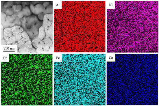 The TEM-EDS elemental mapping of the fabricated Al-Co-Cr-Fe-Ni HEA via wire-arc additive manufacturing and irradiated by HCPEB (30 J/cm2, 50 µs, 3 pulses, 0.3 s−1).