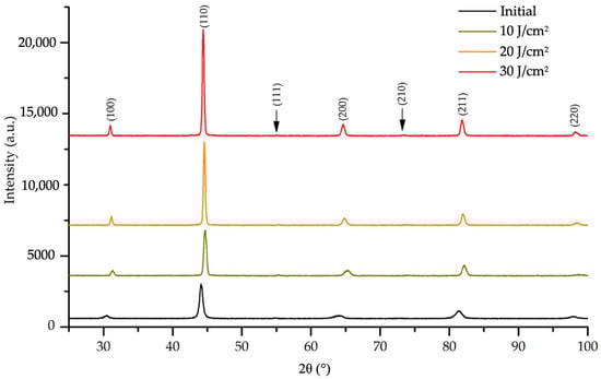 X-ray diffraction was used to investigate the phase composition of HEA samples processed by HCPEB. The initial sample has simple cubic lattice and a lattice parameter of 0.28914. Previously, a similar XRD pattern was obtained in the study of the alloy Fe0.54Ni0.836Al0.624 []. A diffraction patterns obtained on a HEA sample before and after irradiating by HCPEB is shown in Figure 12.