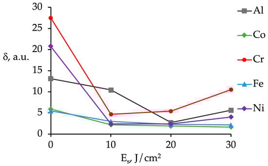 The inhomogeneity distribution coefficient (δ) of chemical elements in the HEA vs. energy density of an electron beam (Es).