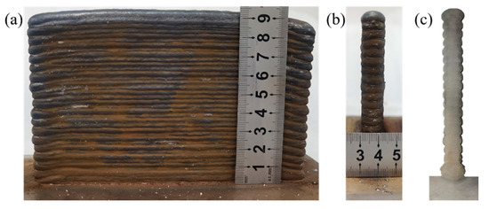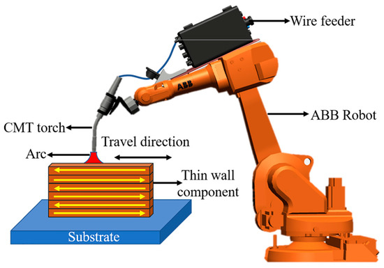 Flexible and digital manufacturing technologies, such as additive manufacturing (AM), have evolved as the future of modern manufacturing, exhibiting the capability to obtain multi-dimensional components and material functionality improvement [1]. Wire arc additive manufacturing (WAAM) is a branch of AM that has the advantages of fast forming speed, high material utilization rate, and low production cost, which is a good method for manufacturing large parts in aerospace, shipbuilding, automobile industry, and other fields [2]. The technology uses electric arc or plasma arc as the heat source to melt the metal welding wire, and the main forms are gas metal arc welding (GMAW), tungsten arc welding (TIG), plasma arc welding (PAW), etc. [3,4,5]. According to the principle of layer-by-layer accumulation, the three-dimensional metal blanks close to the product shape and size requirements are manufactured from the line-surface-body according to the three-dimensional digital model.