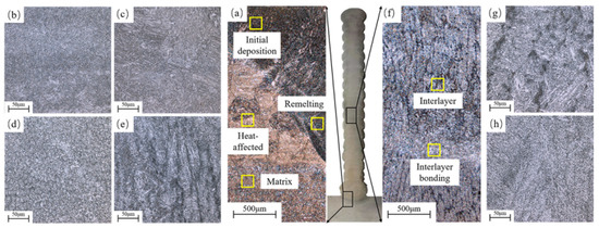 Metallographic micrograph: (a) the junction of the matrix and the deposited part; (b) the matrix; (c) the heat-affected zone; (d) the remelting zone; (e) the initial deposition zone; (f) the deposition stability zone; (g) interlayer zone; (h) interlayer bonding zone.