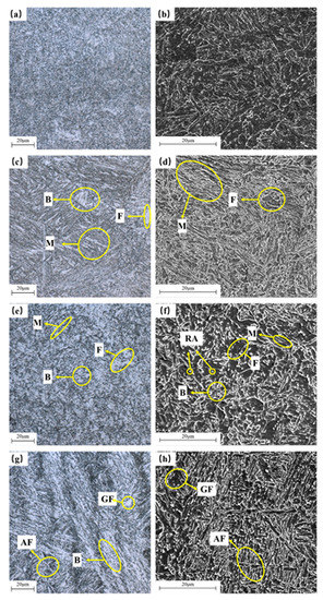 Figure 5g,h shows the microstructure of the initial deposition zone, which was mainly composed of acicular (acicular ferrite, AF) and massive ferrite (granular ferrite, GF), and granular bainite. There was obvious element segregation in the initial deposition zone, which was mainly due to the non-equilibrium solidification of the molten pool. The initial deposition layer was close to the matrix, the cooling rate was very fast, the temperature gradient was large, and a certain degree of component overcooling was formed. The solute was continuously discharged to the side sub-grain boundaries during the grain growth process, and the solid phase diffusion was limited after solidification, which eventually led to the high content of alloying elements in some zones. Acicular ferrite had a certain orientation, as shown in Figure 5g. In Figure 5h, the black lumps were ferrite and the strips of the acicular ferrite, and there were no defects (such as cracks and holes). EBSD analysis showed that the grain orientation of the initial deposition zone was mainly in the direction of (101), and the grain size was not uniform. There was a consistent grain growth direction in some zones caused by the consistent heat dissipation direction, which was consistent with the results obtained from the metallographic structure. Compared with the heat-affected zone, the average grain size of the initial deposition zone was coarser and uneven, and the number and size of the deformed structures increased significantly, as shown in Figure 6d and Figure 7d.