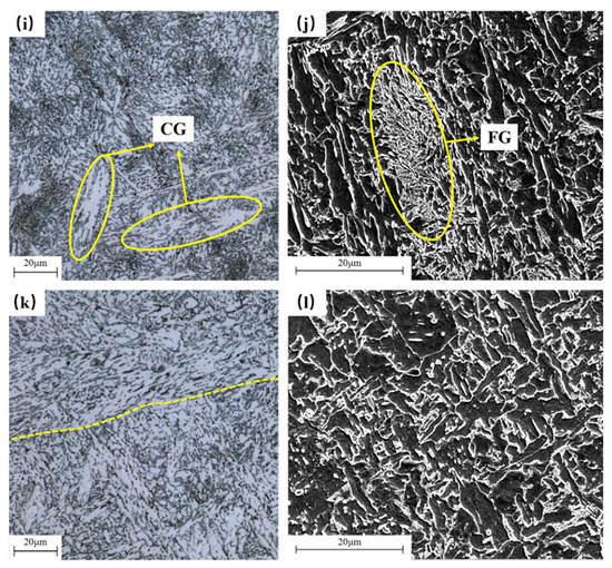 Figure 5i,j shows the microstructure of the interlayer zone. Under the influence of the reciprocating deposition, the coarse-grained (CG) and fine-grained (FG) zones appeared in the interlayer zone, and the microstructure was mainly acicular ferrite, lath ferrite and granular bainite. The inhomogeneous distribution of the microstructure in the interlayer may be due to the inhomogeneous diffusion of the atoms during the cooling and solidification. In Figure 5j, the black block was ferrite and the strip was lath ferrite. EBSD analysis showed that the grain orientation in the interlaminar zone was more uniform, but the average grain size was larger than that in the initial deposition zone, while the number of recrystallization and substructure had no obvious change, as shown in Figure 6e and Figure 8e.