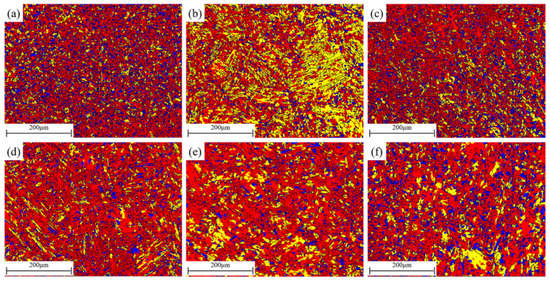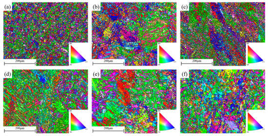 IPF X coloring map obtained by EBSD: (a) the matrix; (b) the heat-affected zone; (c) the remelting zone; (d) the initial deposition zone; (e) interlayer zone; (f) interlayer bonding zone.
