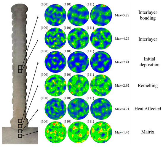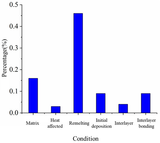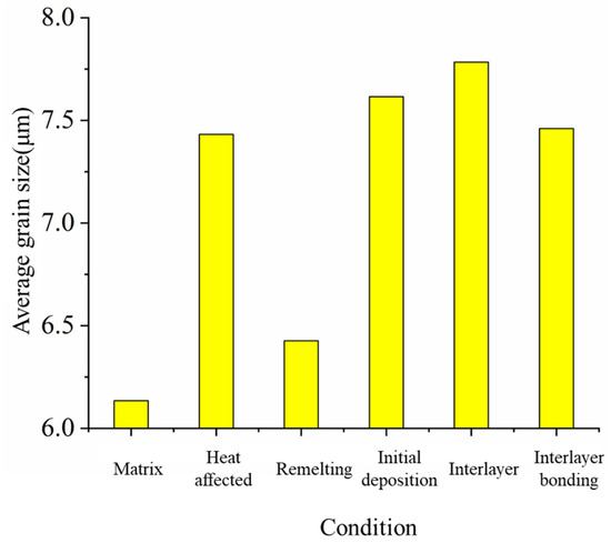 Figure 9 shows the pole diagram of different positions, which is helpful to further study the internal relationship between organizations. The maximum density of the initial disposition zone was 7.41, the stable deposited zone was 4.27, and the interlayer bonding zone was 5.28. Compared with the matrix, heat-affected zone and remelting zone, the texture in the initial deposition zone was more obvious. With the increase of the deposition layers, the grain distribution became more uniform, and the texture phenomenon gradually weakened. The texture in the interlayer bonding zone was slightly higher than that in the deposition stable zone. Figure 10 shows the statistical results of the grain size in different zones. The average grain size first increased and then decreased from the matrix to the heat-affected zone and then to the remelting zone. The maximum average grain size in the heat-affected zone was about 7.4 μm, the minimum average grain size of the quenched and tempered steel matrix was about 6.15 μm, and the average grain size of the remelting zone was between the two. The average grain size of the interlayer was about 7.8 μm, the minimum interlayer bonding zone was about 7.5 μm, and the average grain size of the initial deposition zone was between the two. The interlayer bonding zone was equivalent to the “remelting zone” in the deposition process of each layer, and the cooling rate of the interlayer bonding zone was faster than that of the interlayer bonding zone, resulting in the decrease of the grain size in the zone.