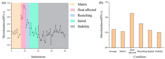 The microhardness distribution from the matrix to the deposition layer is shown in Figure 11a, and the average value of the microhardness in different zones is shown in Figure 11b. The overall hardness of the matrix was roughly 241.5–265.3 HV0.2, with an average of 253.4 HV0.2. The fluctuation of the matrix microhardness was small, which indicated that the microstructure of the matrix was more uniform than that of other parts. The overall hardness of the heat-affected zone increased significantly, with an average value of 313 HV0.2, which was due to a large amount of martensite structure produced by the heat-affected zone. The average hardness of the remelting zone was 278.8 HV0.2, the initial deposition zone was 257.7 HV0.2, and the hardness of the remelting zone was increased by about 8%. According to Section 3.2, due to the remelted zone cools faster than the deposition layer, there was some martensite that did not completely undergo phase transformation, which improved the hardness of the remelted zone to some extent. The average hardness value of the deposition stability zone is 250.3 HV0.2, which was equivalent to that of the initial deposition zone, and the hardness change of the deposition layer was 221–282 HV0.2. There was a periodically changing structure after deposition between the interlayer zone and interlayer bonding zone, and the obvious delamination can also be observed from the macroscopic section, which led to the uneven hardness values. Meanwhile, it can be seen from Figure 5g,i,k that the microhardness of the deposited layer fluctuated greatly which was ascribed to the texture phenomenon and obvious micro-segregation. The change of the microhardness was related to the thermal cycle and cooling rate of different parts, and the microhardness of different positions was affected by the heating of the previous layer [32].