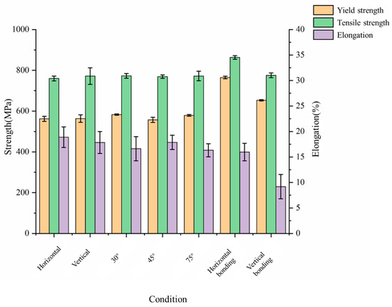 Figure 12 shows the tensile test results in different orientations. The yield strength and tensile strength in the horizontal position and the vertical position were basically the same, and there were no obvious anisotropic characteristics in the formed part. The yield strength reached 560 MPa, which was 94.9% of the minimum standard of the welding wire, and 81.4% of the matrix. The tensile strength reached 760 MPa, which exceeded the minimum standard of the welding wire (655 MPa) and reached 94.8% of the matrix. The yield strength of the sample in the directions of 30°, 45°, and 75° was more than 550 MPa, the tensile strength was more than 760 MPa. The overall yield strength was more than 93.2% of the minimum standard of the welding wire and reached more than 79.9% of the matrix, the tensile strength was more than the minimum standard of the welding wire and reached 94.8% of the matrix, which indicated that the overall tensile performance of the formed part was excellent. The average elongation of the deposition layer in different directions was 17.5%, which was 89.7% of that of the matrix, reaching the lowest level of that of the welding wire. Based on Section 3.2, the deposition was relatively dense as a whole which was composed of ferrite and bainite, and there was no apparent porosity, inclusions, and other defects. The matrix was modulated steel, which was mainly composed of sorbite. The strength of the deposited layer was lower than that of the matrix, and there was obvious element segregation, resulting in the uneven structure of the deposited layer, which reduced the strength and toughness. This was basically consistent with the microstructure.