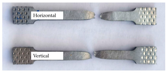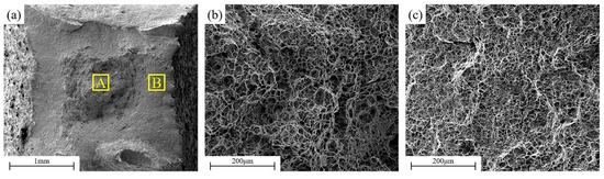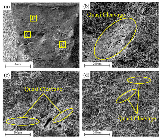 The fracture morphologies of the horizontal and vertical specimens are shown in Figure 13, Figure 14 and Figure 15, and Figure 13 shows the fracture sample. There were obvious divisions in the horizontal fracture, as shown in Figure 14a. The enlarged zone A showed an obvious ductile fracture morphology with relatively uniform equiaxed dimples, as shown in Figure 14b. Zone B also showed a ductile fracture morphology, but the dimples were relatively shallower than zone A, as shown in Figure 14c, indicating that the central position of the sample had better toughness. There were three obvious characteristic zones in the vertical fracture, as shown in Figure 15a. In addition to ductile fracture, zone C also had the characteristics of the quasi-cleavage fracture, as shown in Figure 15b. The two zones D and E had the characteristics of the quasi-cleavage fracture. Zone D and E were smaller than that of C, and both showed higher ductility. In addition, there were large long strips of deep dimples in zone D, which were characterized by mixed fractures of dimples and sporadic quasi-cleavage, as shown in Figure 15c,d. The results showed that the toughness of the horizontal direction was better than that of the vertical direction, which was consistent with the test results of the tensile experiment.