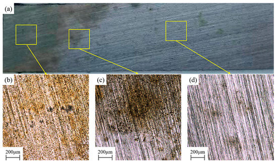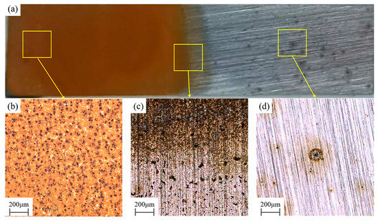 Morphologies after immersing in 3.5% NaCl solution for 12 h: (a) Macroscopic image; (b) Optical microscope image of the deposited layer; (c) Optical microscope image of the junction; (d) Optical microscope image of the matrix.