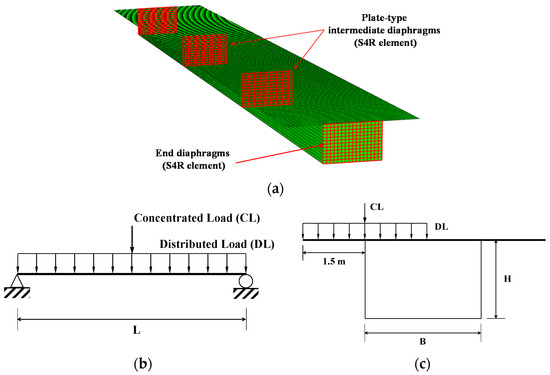 FEA was performed using ABAQUS [27] to evaluate the distortional warping normal stress and intermediate diaphragm spacing for different live loads. The composite box girder with plate-type intermediate diaphragms was modeled using a 3D shell element (S4R) (Figure 2). The box girders under simply supported the boundary conditions with torsional constraints to prevent overturning induced by the torsional moment at each end, which was free to undergo warping at each end. The applied live loads analyzed in this study consisted of load combinations of both trucks and lane loads (LC1 and LC2) and design truck load (LC3), as listed in Table 1. Load cases 1 and 2 (LC1 and LC2) represent the cases of the combined truck and lane loads specified in AASHTO [24] and the Korean Design Standard [25], respectively, whereas load case 3 (LC3) represents the case of the design truck load specified in the Korean Design Standard [25].