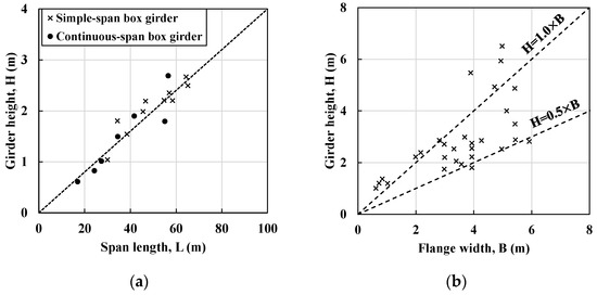 The box section dimensions and spans () were determined based on practical bridge data obtained from the Korean Design Manual [28] to establish the FEA models. Typically, the girder height () and span () are critical design parameters for designing the stiffness of the entire bridge system. An appropriate girder height () should be selected to prevent excessive girder deflections during construction, and it can be determined based on the span (). In this study, the girder height () was assumed to be 1/25 times the span () to satisfy the provisions of AASHTO [24] and KDS [25] and to prevent excessive vertical deflection. Additionally, the span specified in the design codes [24,25] yielded more reasonable calculated values than the practical bridge data shown in Figure 3a.