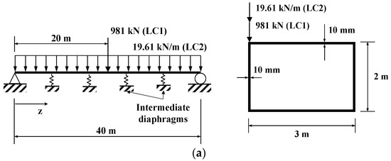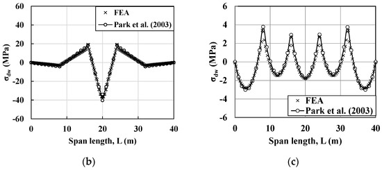 Before the load combination effects on the distortional behaviors of simple-span box girder bridges were evaluated, the FEA was verified using analytical data obtained from the literature. Park et al. [9] formulated nine degree-of-freedom beam elements to analyze the distortional behaviors of box girder bridges. An example of an FEA model of a box girder under eccentric loading is depicted in Figure 4. The model had a 40-m span with a 3-m flange width and 2-m girder height. The flange and web panels were 10 mm thick. A 981-kN concentrated load was applied at the box section edge in the middle of the span. This concentrated load had an eccentricity of 1.5 m from the centroid of the box section. Simply supported boundary conditions for flexure were adopted with torsional constraints at each end to prevent the overturning of the girder. A fine mesh with 16 elements along the flange width was used, and the same mesh size was adopted for the entire box girder modeling. The 3D FEA models established in this study showed good agreement with the analysis results reported in the literature (Figure 4b).
