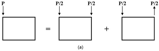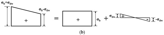 The distortional warping normal stress components developed at the bottom flanges were obtained from the FEA results. The components were determined by decomposing the normal stress resultants into the bending normal stress and distortional warping normal stress (Figure 7). The bending normal stress () could be obtained by calculating the average normal stress between each outer end of the bottom flanges, and the differences between the normal stress of each tip and the assumed bending normal stress were defined as the distortional warping normal stress (). Since the normal stress magnitude generated by pure torsion was negligible, the calculation process could yield reasonable distortional warping normal stress () values.