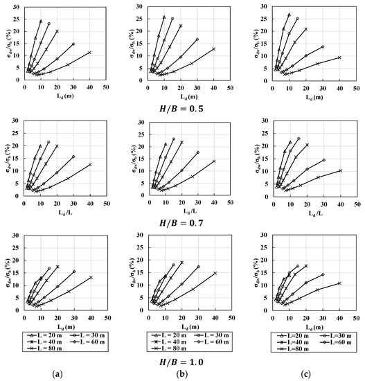 Variations in distortional warping normal stresses with the design load components, H/B, and L. (a) H/B = 0.5, (b) H/B = 0.7, and (c) H/B = 1.0.
