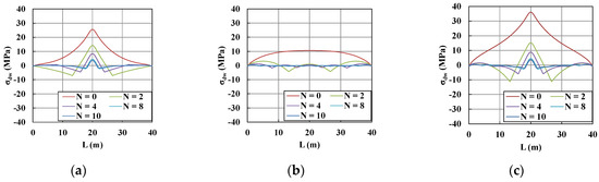 Distortional warping normal stress distributions of a bridge model with span of 40 m and H/B of 0.7 along the span when LC1 was applied. (a) Concentrated load (truck load), (b) distributed load (lane load), and (c) combined design truck and lane load.