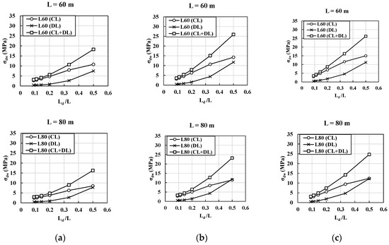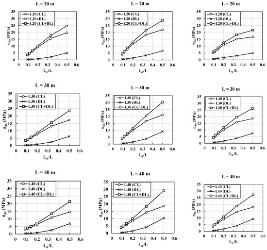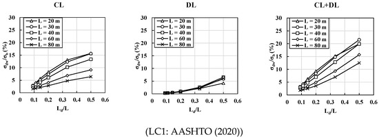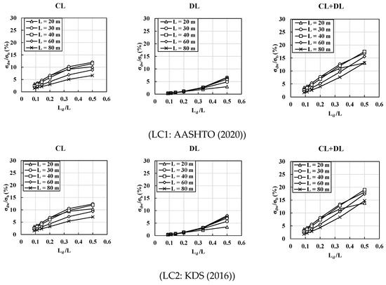Figure 10 shows the relationships between the maximum distortional warping normal stress () and the normalized diaphragm spacing () for different loads and spans (). In the analysis, LC1 comprising a load combination of a 425.6-kN design truck and 12.4-kN/m design lane load was applied, as stipulated in AASHTO [24]. The distortional warping normal stress values could be considered as the sum of the stresses induced by the concentrated and distributed loads. Thus, the FEA results were divided into two stress values for the concentrated load and distributed load, as shown in Figure 10. Several aspects of the distortional behavior were observed, considering the load type. All the distortional warping normal stresses under concentrated loads (CL in Figure 10) were significantly higher than those under distributed loads (DL in Figure 10), except for the case of the 80-m span. In contrast, the distortional stresses of the 80-m span cases under the distributed live loads had a close value with those under the concentrated loads. Hence, the effects of design lane loads were more significant when the span increased, whereas the concentrated load was more influential in smaller span bridge models.