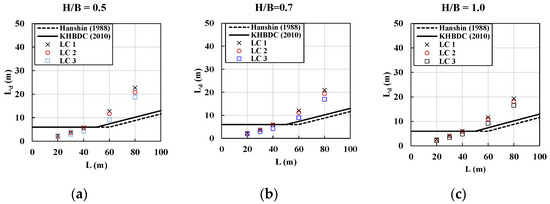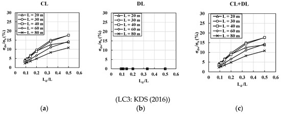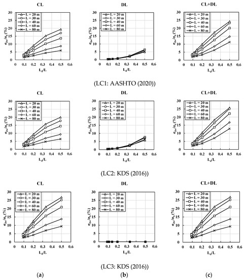 In the previous section, it was reported that the magnitude of the concentrated live load significantly influenced the normal stress ratios of box girder bridges, where higher concentrated live loads may result in higher normal stress ratios. LC3 had the highest concentrated live load of 100% [26] with a 637.5-kN truck load, which could be determined as 510 kN times (1 + 0.25). It tended to provide the minimum required intermediate diaphragm spacings, compared with the LC1 and LC2 cases. Moreover, the LC2 cases showed the minimum required intermediate diaphragm spacing when the span was 80 m, because the distributed loads exhibited a significant impact when the span increased. These aspects showed a similar tendency, regardless of the cross-sectional aspect ratio ().