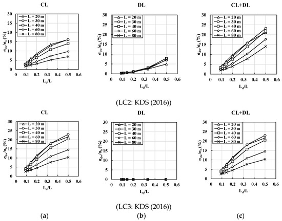 Normal stress ratio based on the intermediate diaphragm spacing (Ld) and span length (L). (a) LC1, (b) LC2, and (c) LC3.